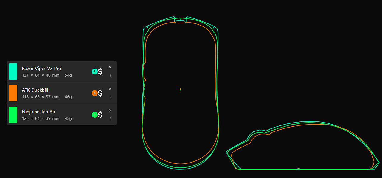 Bu bütçede marka bir ürün istiyorsanız simetrik yapısıyla Viper V3 Pro tercih edilebilir, ancak scroll (tekerlek) kalitesi hala pek iyi değil. Eski modelde Switch sorunları yaşanıyordu ama Kailh'den T.C.'ye geçerek çözüldü o sorun. Teknik olarak Focus Pro 35K Gen-2 sensör ve Nordic NRF52840 MCU kullanıyor. Ninjutso Ten Air, PixArt AIMNINJA (PAW 3950) sensör ve PixArt MCU ikilisiyle claw tutuş için gayet uygun. Duckbill ise bu bütçenin en iddialılarından; PAW3950 Ultra sensörün yanı sıra yeni nesil Nordic 54H20 MCU barındırıyor ve claw tutuşa uyumlu, Kaplama olarak da gayet iyi bir model. Tek eksisi MCU güçlü olduğu için batarya verimsiz. Ninjutso Sora V2 ise PixArt PAW 3395 sensör ve Nordic NRF52840 MCU kullanarak yine claw tutuşa hitap ediyor. Son olarak Pulsar X2 Crazylight'ın şu an stoğu yok ama geldiğinde alınabilir; XS-1 (PAW 3950) sensör ve Nordic NRF52840 ile donatılmış bir model.
