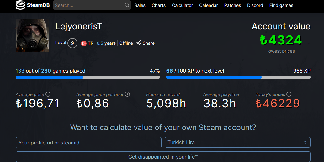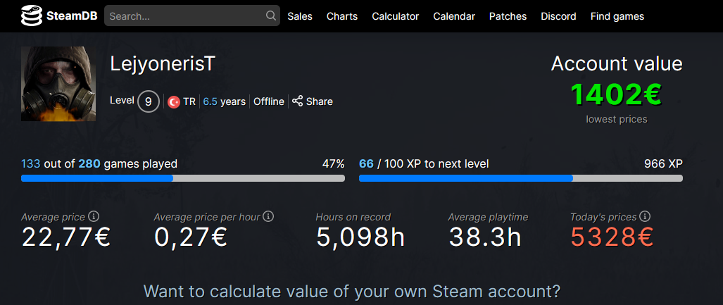 Steam hesabımın değeri ile ilgili olarak, elbette minimum miktar göz önünde bulundurulmalı fakat euro şeklinde görüntülediğimde yanılmıyorsam sağ üstteki yeşil ibareli değer (minimum ederi) 1.402 € olarak görüntülenmekte fakat Türk lirası olarak görüntülemek istediğimde 4.324 ₺ olarak hesabı yapılıyor.