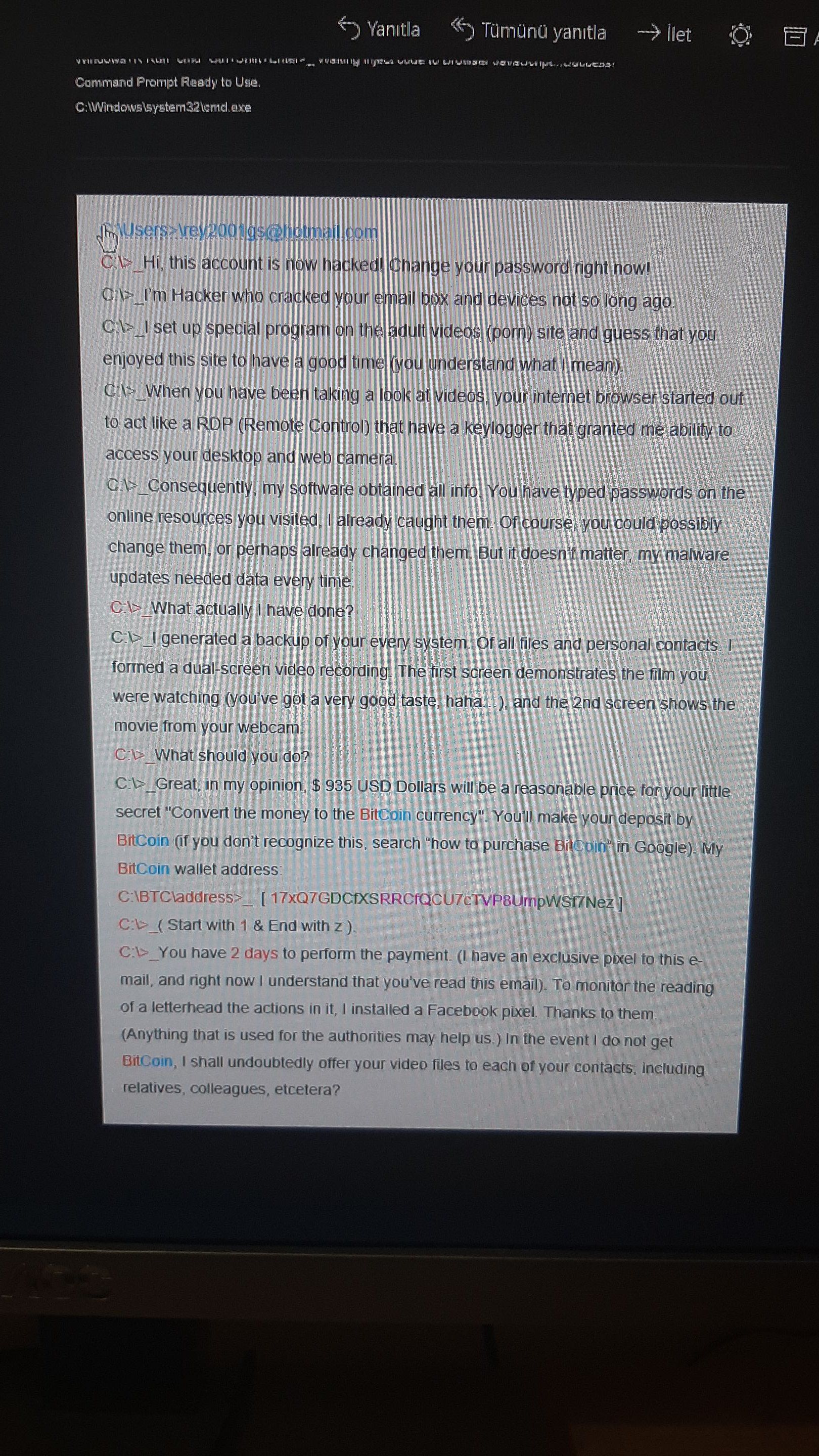 Resimdeki gibi bir mail geldi bayağıdır kullanmadığım hesabıma, bu adam benim hesabı hacklemiş, zorla sızmış ne derseniz. Ne yapmam gerek? Panik atak hastasiyim, elim ayağım titriyor bunu yazarken, adam 935 dolar istiyor, öğrenci adamım.