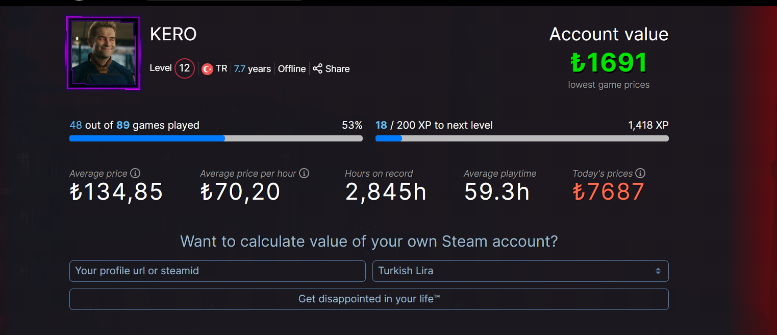 https://steamdb.info/calculator/ buradan bir hesaplayın hocam.