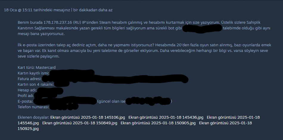Normalde ben bilinçli bir kullanıcıyımdır, öyle her linke tıklamam ve resmi kaynaklar dışında oyun veya uygulama yüklemem. Discord'da jack işte hocamızın hesabı çalınmış ve hiçbirimizin haberi bile yoktu. Baktım sunucuda "Steam 50 USD gift" gibisinden bir link yollamış, ben de o linke tıkladım ve resmi Steam'in giriş sayfası ile aynı bir sayfa karşıma geldi ve ben de hesap bilgilerimi girdim. Hemen bir virüs taraması yaptım ve sorun bulunamadı deyince rahatlamıştım. 16 Ocak günü akşam e-posta hesabıma bir baktım ki telefon numarası, e-posta ve Steam Guard kaldırılmış. Steam destek ile mevcut e-posta adresim üzerinden iletişime geçtim ve bana Steam Destek :: Sahiplik Kanıtının Sağlanması burada ki istenen bilgileri paylaşmamı istediler. Bilgileri yolladım ve sonra bana ilk e-posta üzerinden talep açın yoksa hesabınızda değişiklik yapamayız dediler. Ben de hemen ilk e-posta üzerinden talep açtım ama halen cevap yok. Ne yapmalıyım?