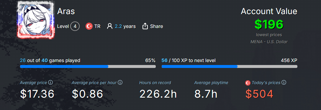 Merhaba. Şu anda bu Steam hesabımı kaç liradan satabilirim? Satma gibi bir amacım yok ama yine de bir öğreneyim dedim.