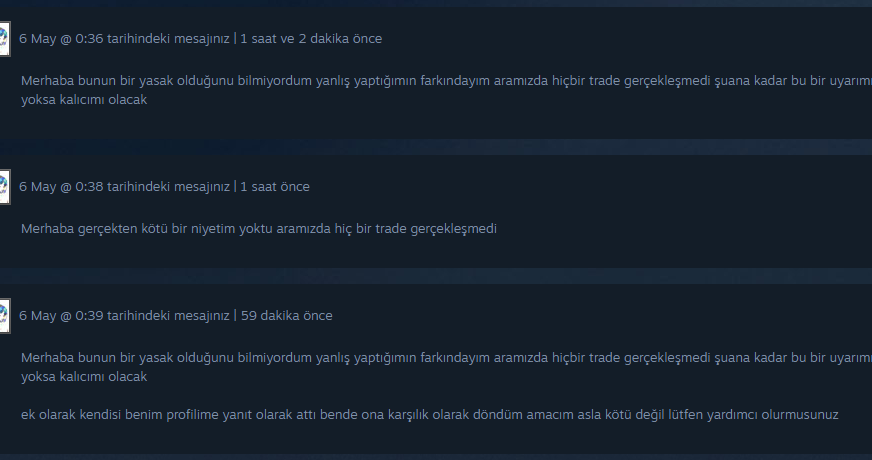 CSFloat üzerinden bir bıçak satışı yapıyordum. Evde olmadığım bir gün, bir kullanıcı teklif göndermiş ancak göremediğim için geri dönüş sağlayamadım. Daha sonra bu kişi Steam profilime “hey bro, look CSFloat pls” şeklinde bir mesaj yazdı. Ben de onun hesabına geri yanıt verdim ekran görüntüsünde ki gibi. Bu akşam Steam hesabıma giriş yapmaya çalıştığımda bir uyarı aldım ve hesabım kilitlendi. Hesabımda çok değerli oyunlar ve eşyalar bulunmakta. Hiçbir şekilde kötü niyetim yoktur; sadece ticaret amaçlı bir konuşmaydı.