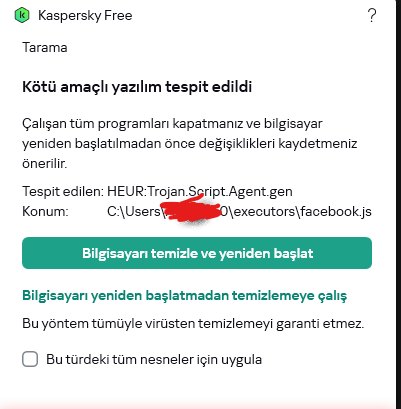 Boş boş dolanırken bir anda karşıma Kaspersky'nin böyle bir uyarısı çıktı. C:/Users/ismim/AppData/Local/Google/Chrome/User Data/Default/Extensions oradan değişik bir isimle executors/facebook.js diye bir şey buldu, bunu böyle sınıflandırıyor, bilgisayarı temizle ve yeniden başlat diyor. Ne yapmalıyım?