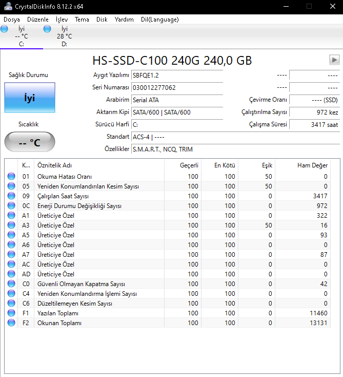 HDD için yeniden konumlandırılan kesimlere, sapma yineleme sayısına, uçtan uca hatalara, bildirilmiş düzeltilemeyen hatalara, bekleyen kesimlere ve düzeltilemeyen kesimlere bakın. Düzeltilemeyen hatalar haricinde diğerlerinde sıfırdan farklı bir değer varsa diskte bir sorun vardır. Bazıları için 1 olması sorun yaratmaz.