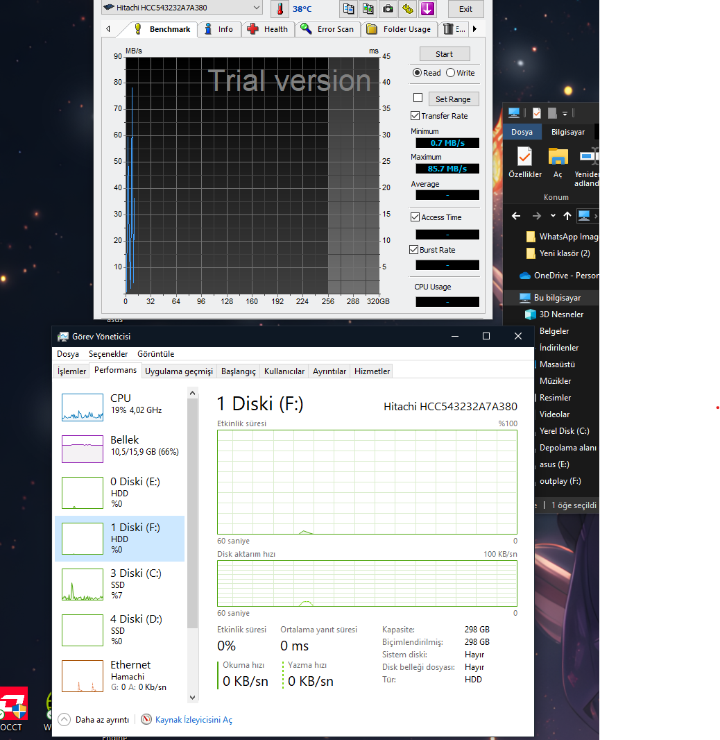 Arkadaşlar elimde Hitachi marka bir HDD var içine attığım videoları açmaya çalışıyorum. Resmen 5 6 dk bekletip hala videoyu açamıyor çok yavşa çalışıyor. Dosya geçişleri falan rezalet HD tune testine koyuyorum. 3 sn test yapıyor sonra bir anda test duruyor ve görev yöneticinde HDD kullanımı 0'a düşüyor. Aynı model HDD'den bir tane daha var o testi gayet başarılı geçti.