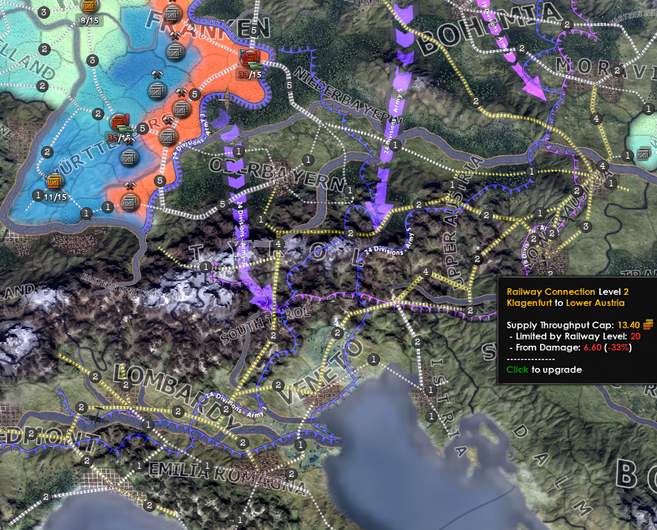 Çeşitli kaynaklardan railway dağıtım sistemini öğrenmeye çalıştım. Size sorduğum şey şu. Eğer italyaya çok fazla asker ile dalmak istiyorsam sınırdaki bütün provincelere supply hub mı döşemem gerek? Fakat işin ilginç tarafı italya'nın ne doğru düzgün bir railway sistemi var, ne de supply hub'ları. Buna rağmen benim yarımdan az askerle beni alıyorlar. Şu resme bakın: