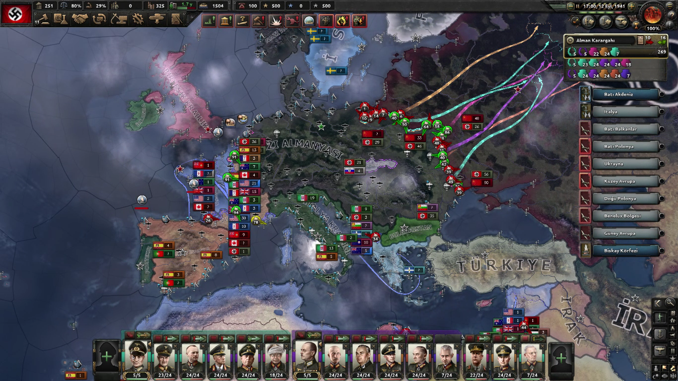İntikamımı aldım ve 30 saati geride bıraktım. Sıra Sovyet savaşında 10 20 bölük 40 width Panzerkampfwagen tümeniyle gireceğim. Ayrıca kaynak sorunu yok artık Hindistan falan hepsi bende.Bence Almanya ile oynarken 1938 yıllarında en 100 sivil olmaya çalış. Ardından askeriye hızlıca dön. Oyun başında verilen askeri fabrikalarla sadece piyade tüfeği ve uçak bas. Birkaç tane de top, destek ekipmanı. Odaklarınla güçlen ve 1939 şafağında Polonya'ya odağın ile gir. Zaten erken girmiş olduğun için Paris'e girdiğin anda Fransa düşecektir. Ayrıca ''medium'' tank basmanı öneririm. Savaşa kadar 3 tane 40 width çıkarabilirsen karşında kimse duramaz.