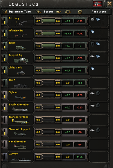 Kırmızı renkteki yani eksideki ekipmanları gösteriyor bu ekipmanları yukarıda da anlattığım üzere prodoctions kısmından üretmen lazım. Bu ekipmanları ürtettikçe askerlerine ekipmanlar dağıtılacak ve savaşta daha çok verim alacaksın.