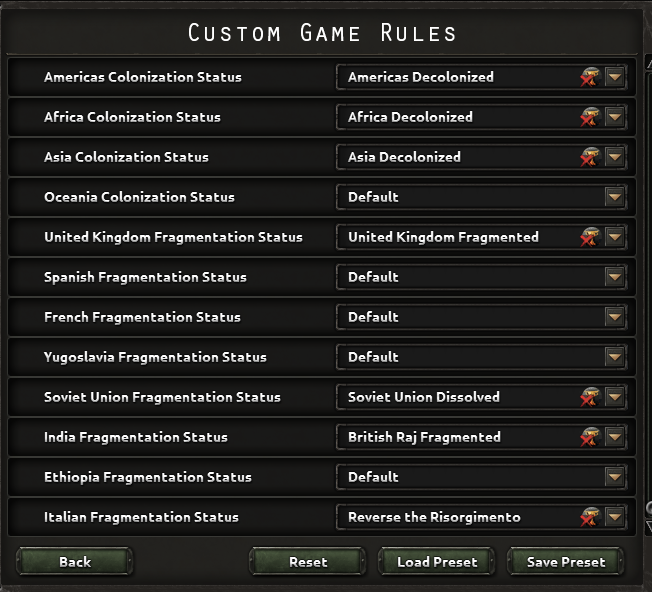 Tabii ben her şeyi ayarlamadım şuan Avustralya hala sömürge veya İtalya tamamen dağılmış durumda siz bu ekrandan istediğiniz ayarları yapın ona göre oluşur map. Anlamadığın bir yer olursa sorabilirsin.
