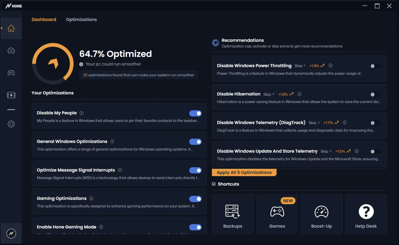 Hayır deneyimim yok ancak inceledim, bu tip programlar Windows'un arka planda çalıştırdığı servisleri optimize eder (nasıl yaptığını da söylemezler.) Windows'da hazır gelen izleyici telemetrilerini devredışı bırakırlar iyi bir şey aslında. Fakat sahip olduğunuz sistem zaten oynadığınız oyunlara yetişemiyorsa bu tarz programlar yine bir işinize yaramayacaktır.Hone.gg hakkında bir deneyiminiz var mı peki.