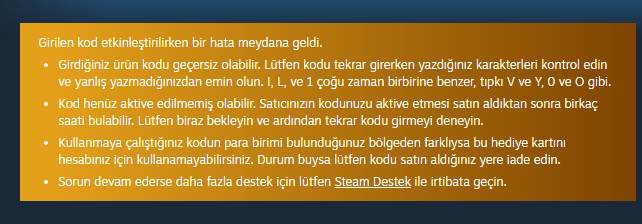 Hopi üzerinden 10 Paracık karşılığında 10 TL değerinde Steam cüzdan kodu satın aldım fakat bana gönderilen mailde yer alan kodu Steam'in cüzdan kodu girme kısmına girdiğimde aşağıda yer alan hatayı alıyorum: