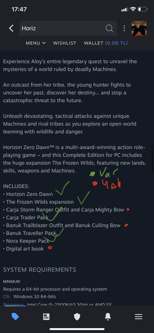Merhaba yakın zamanda Horizon Zero Dawn'ı eneba üzerinden Steam CD key olarak satın aldım. Ve alırken de bunun complate Edition olduğu belirtiliyordu. Her neyse oyuna başladım ve bazı ek içeriklerin olmadığını düşündüm sıkıntı basitti, complate Edition üzerinde yazan kıyafetleri bulamıyordum onun haricinde bana satılan şeyin complate Edition olduğundan ve dolandırılmadığımdan da eminim. Ek içeriğimi nasıl bulurum bana yardım eder misiniz?