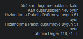O kadar gösteriyorsa tabii ki o kadar düşer. Fiyatlar 50 lira aşağı yukarı oynama yapabilir. Hızlandırma paketleri steam seviyenize bağlı olarak rasgele düşüyor Idle Master ile düşüremezsiniz bir de o fiyatı çıkarın. Zaten dahil değilmiş kusura bakmayın. Bende böyle gözüküyor mesela 4 kart 1 oyun 4 TL.
