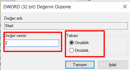 (eğer start dosyası yoksa kayıt defterinde sağ tık yapıp dword 32 Bit olarak seçip oluşturabilirsiniz.)