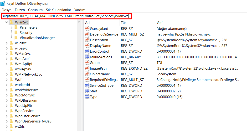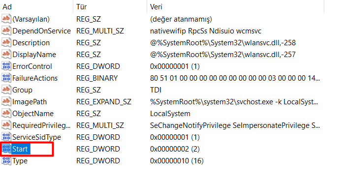 Bilgisayar\HKEY_LOCAL_MACHINE\SYSTEM\CurrentControlSet\Services\WlanSvc bunu kayıt defterine yazdıktan sonra start dosyasını bulun. Ve üzerine iki kere sol tık yapın. değer kısmını 2 ve onaltılık olsun. Bu verdiğim ayarı yaptıktan sonra bilgisayarı yeniden başlatabilirsiniz.
