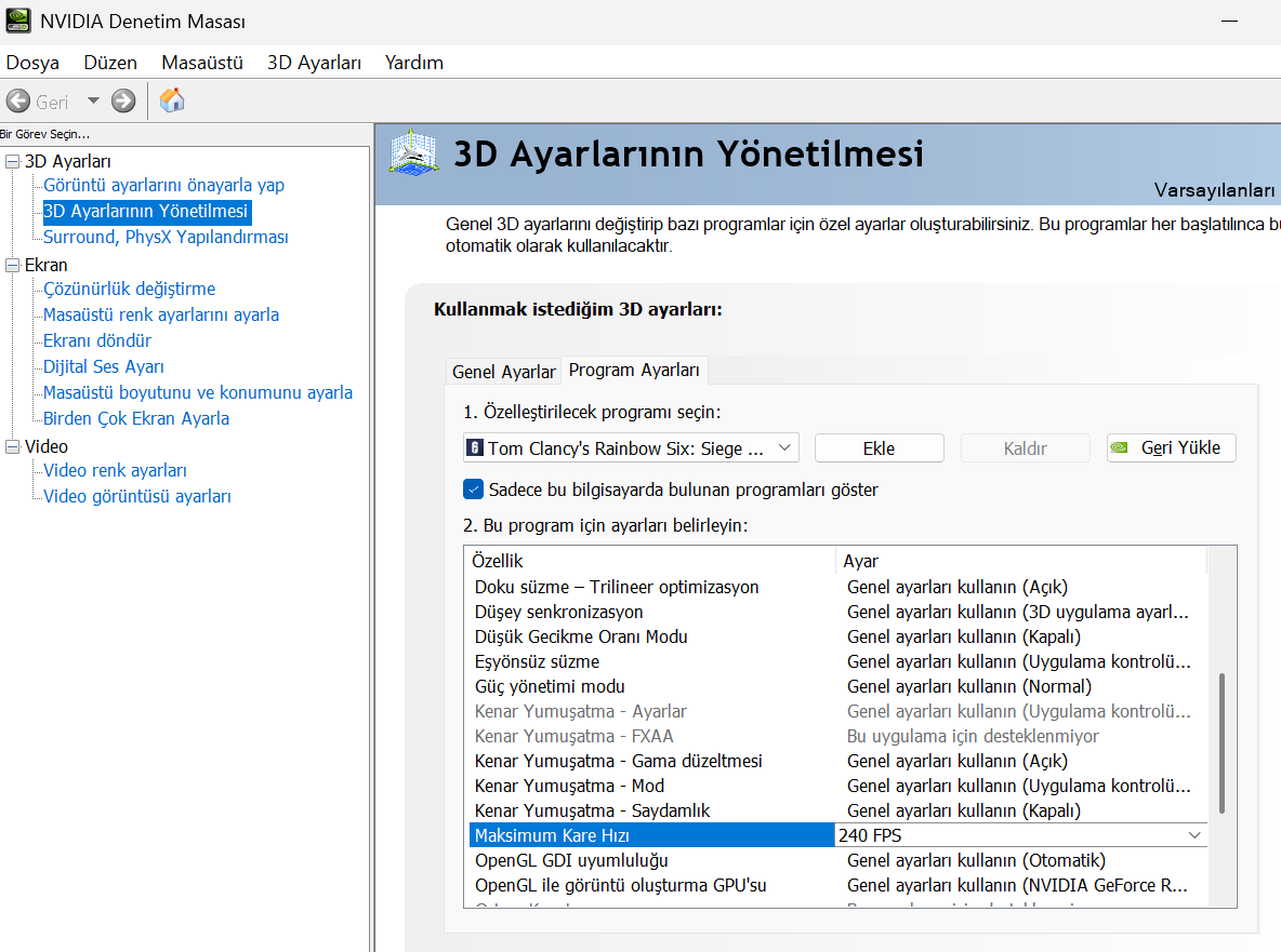 FPS limitleme ise düşündüğünden daha basit aslında. Oynadığın oyunun ayarlarında varsa oradan yapman yeterli olur. Yoksa NVIDIA Denetim Masası'ndan programa özel ayar yaparak "maksimum kare hızı"nı oyununa göre 120 ya da 240 yapabilirsin. Mesela r6s için 240'a kilitledim çünkü operatör seçim ekranında tam anlamıyla sınırsız kare oluşturuyor. Bu da donanıma gereksiz yük binmesine sebep oluyor.