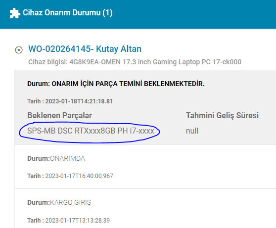 Servise verdim pazartesi günü, bugün şu parçaların yurt dışından sipariş verildiği not düşülmüş. Sanıyorum sorunu anlayamadılar, direkt ekran kartı ve işlemci değişimi yapacaklar. Mantıken ana karta gömülü olduğundan aslında ana kart değişimi yapılacak yanılmıyorsam.