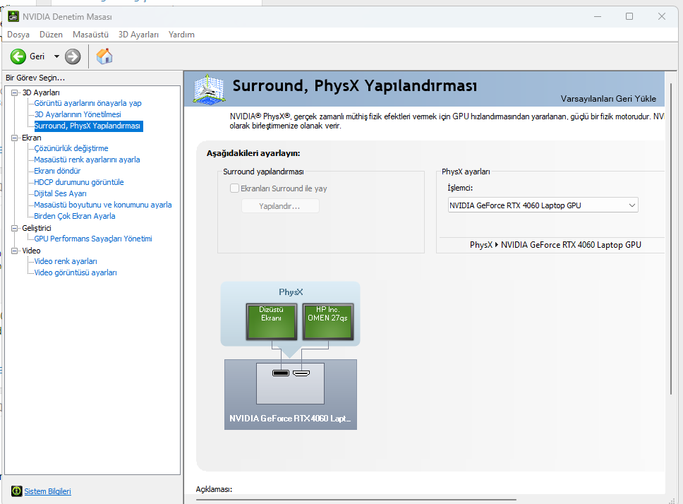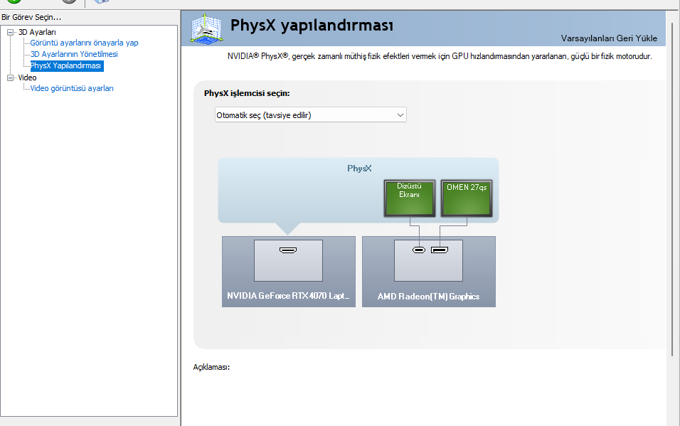 Bu arada nvidia denetim masası üzerinden Phsyx Yapılandırması kısmının ekran görüntüsünü atarsan daha iyi olur bi de oradan bakalım belki senin laptopta farklıdır .