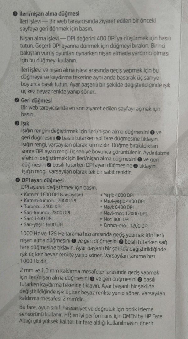 3 tane renk modu var. 1. o an kullandığınız DPI'yı belirten renk (Mesela 800 DPI değerinde mor ışık yanıyor.). 2. istediğiniz bir rengi sabit olarak yanması. 3. nefes modu: Mouse renk değiştirerek yanıp sönüyor. Mousenin programı yok fakat tuşlardan sizin değiştirebileceğiniz özellikler var. Bunlar: DPI, renk modu, 1000 Hz veya 125 Hz arası geçiş, 2 mm veya 1 mm kaldırma mesafesini değiştirme. Bunların nasıl yapıldığı kılavuz da yazıyor alta fotoğraf koyarım.