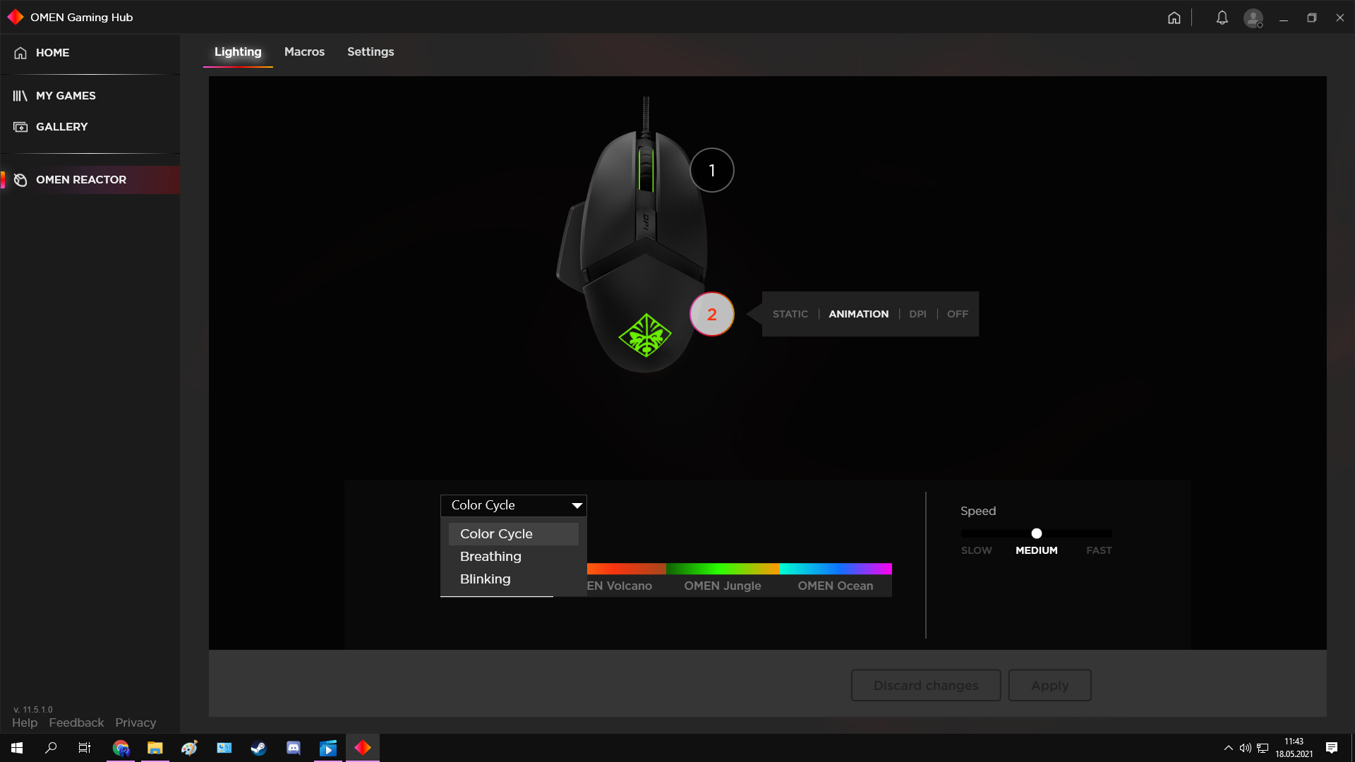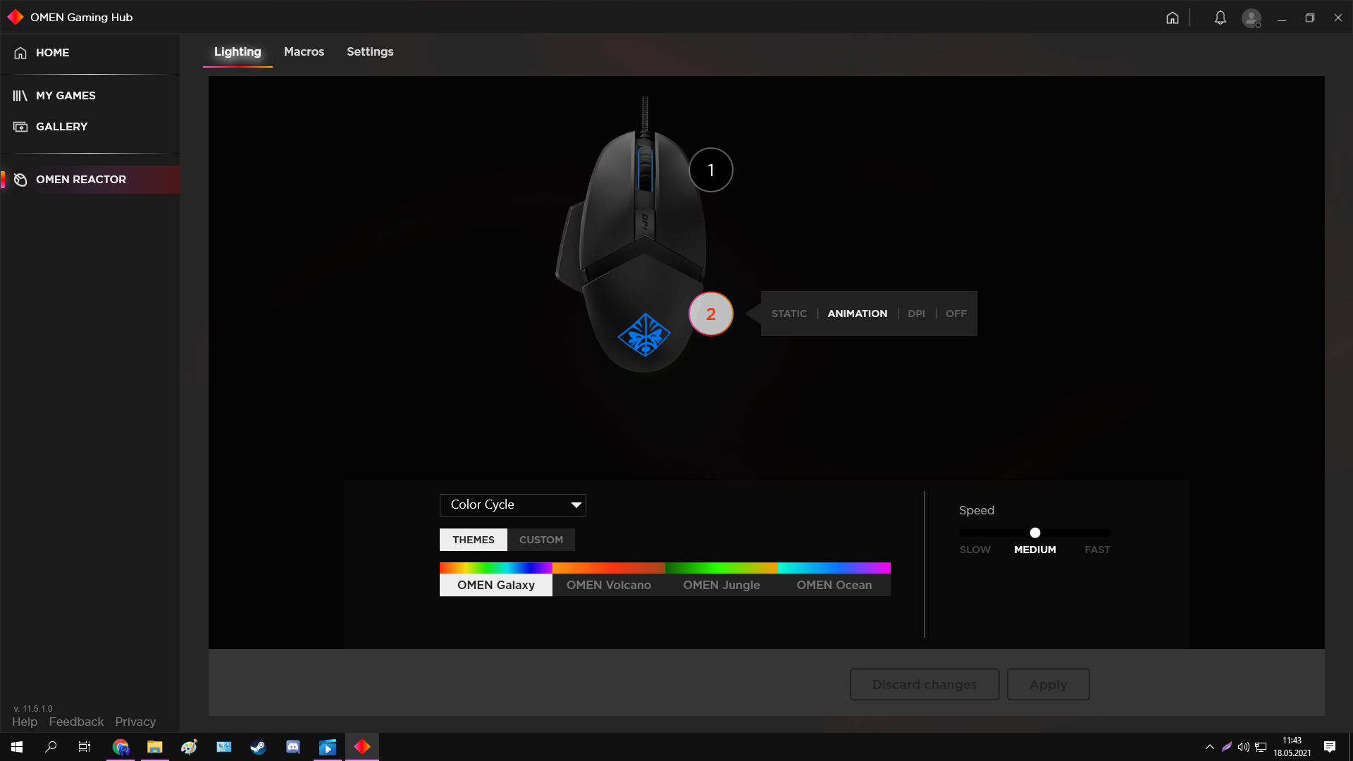 Faremize tıkladığımızda ilk olarak bizi ışıklandırma sekmesi karşılıyor. Static, Animation, DPI ve Off olarak 4 seçenek görüyoruz. Static ışığı tek renge ayarlayabiliyoruz. Animation ise bildiğimiz RGB fakat güzel bir özellik var ki Themes'in altında görebileceğiniz üzere farklı RGB seçenekleri var. Hoş bir özellik olduğunu düşünüyorum. Themes'in sağında olan Custom seçeneğinde ise kendimizin seçebileceği özel renkler ayarlayabiliyoruz. Faremizin her DPI'a özel bir rengi bulunuyor, DPI kısmında ise hangi DPI'da iseniz o fare tekerleğinde o renk oluyor. Off kısmında ise ışıklandırma tamamen kapanıyor. Sağ da olan Speed kısmında ise ışıklandırmanın hızını ayarlayabiliyoruz.