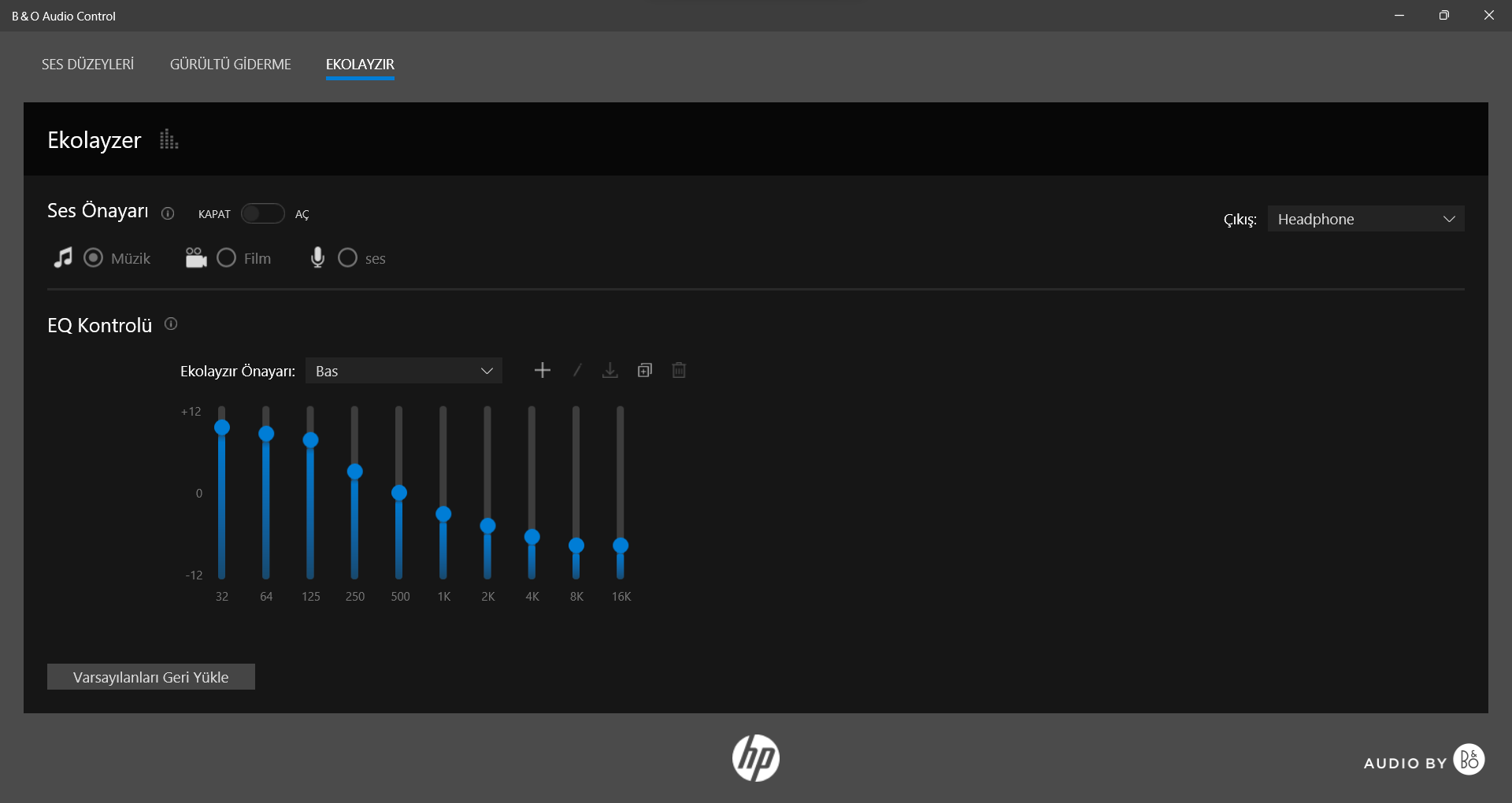 -Çoğu kişinin dert yandı yere gelelim hoparlör. Bende herhangi bir pıt pıt sesi mevcut değil ve son sürüm driver kullanıyorum. Bang and olufsen ile güzel bir iş birliği olmuş. Ben bayağı memnunum hoparlörden. Ekstra olarak B&O Audio Control adında bir uygulama geliyor. Bu uygulama ile ekolayzır, hem mikrofon hem de kulaklık için gürültü engelleme(ben NVIDIA Broadcast kullanıyorum )yapılabiliyor, fena değil. Buradan farklı türlerde ekolayzır ayarı yapmak mümkün;