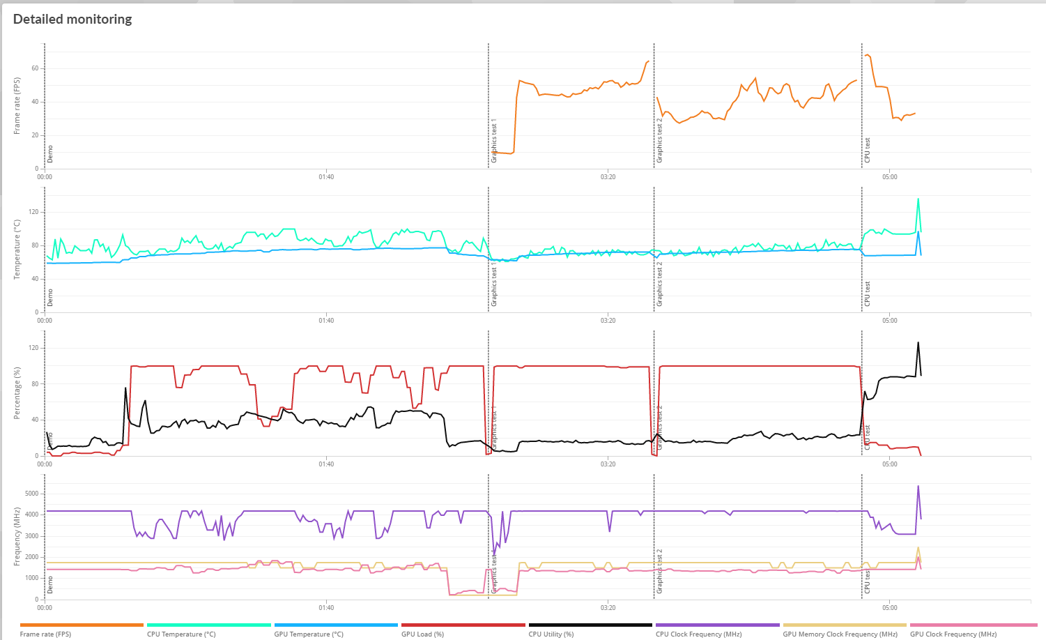 Aşağıdaki testte ise Turbo Boost'u aktif ettim. Zaten daha Demo Test sırasında işlemci sıcaklığı 95 dereceyi geçti. Doğal olarak frekans direkt dalgalanmaya başladı. Grafik testi bölümünde ise 4200 MHz'den 1700'lere kadar ani düşüşler görülebilir. Bu kadar zikzaklı bir performans normal mi? Daha stabil çalışması gerekmiyor mu?