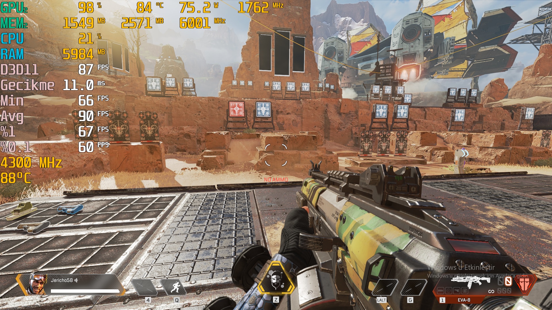 Performans ayarda iken ekran kartı maksimum 75w çekti ortalama 90fps aldık, ekran kartı 84 işlemci 88 dereceyi gördü.
