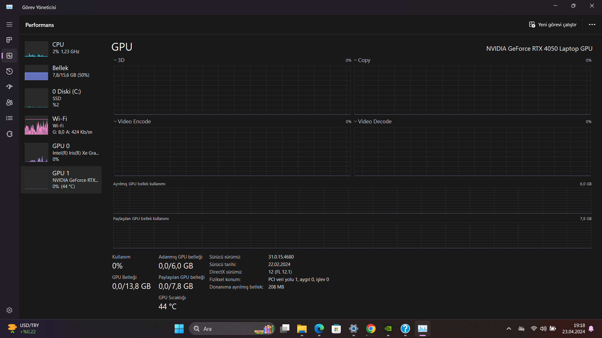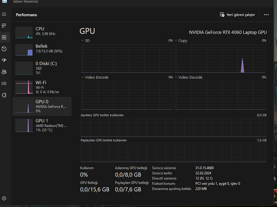 PC'yi daha bugün aldık ve bir sürü sürücüsü yoktu, kendim kurdum. Şimdi de ayarlardan baktığımda Intel'in ekran kartı gözüküyor, RTX 4050 görev yöneticisinde %0 olarak gözüküyor.
