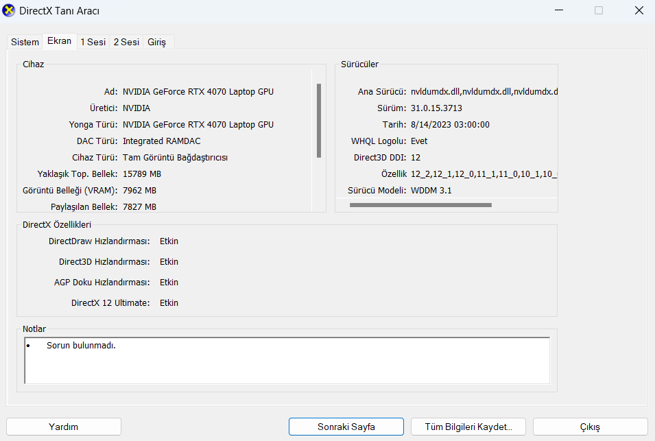 Normal değil. Cihaz kurulu mu geldi yoksa siz mi kurdunuz? RTX 4070 yerine dahili grafiği kullanıyor olabilir. Arama'ya dxdiag yazıp Ekran 1,2 veya Oluşturucu alanında RTX 4070 kartınız yüklü mü kontrol edin değilse En Yeni Resmi GeForce Sürücülerini İndirin adresinden RTX 40 Series (Notebook) seriisinden kartın sürücüsünü yükleyin.