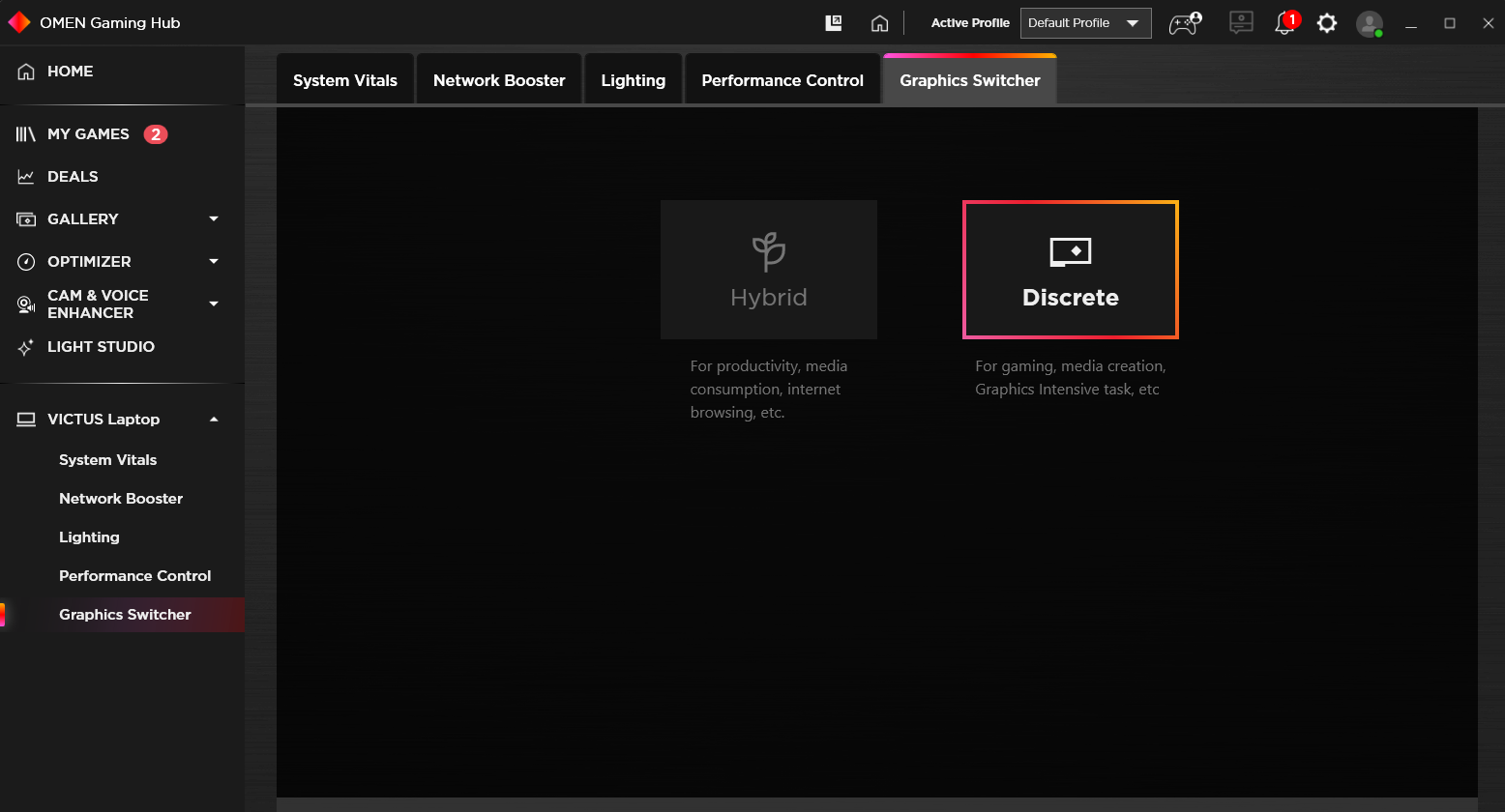Technopat videosunda anlatıldığı gibi Omen uygulamasından harici ekran ekran kartını seçtim.