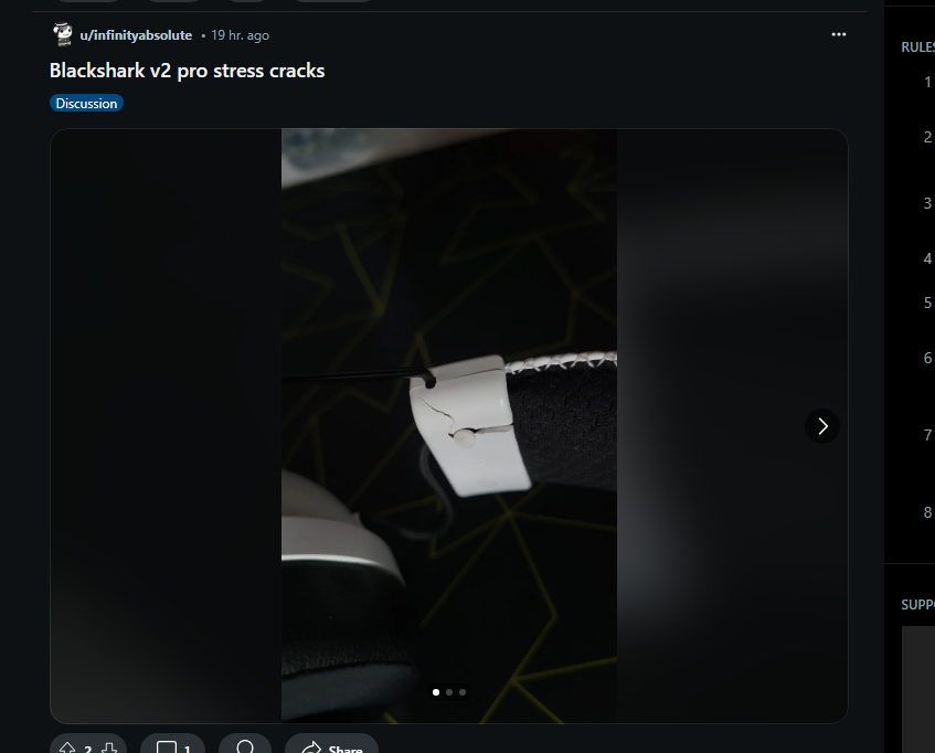 Fiyatına göre iyi, napayım arkadaşa V2 PRO 2023 çok iyidir kesin al mı diyim , 2 ay kullanıcak menteşesı kopucak fotolardakı gibi , sadece reddite girdim ve razer'a tıkladım blackshark v2 pro 2023 hakkında 1 gram birşey bile yazmadım 2 günde milyonlarca şikayet gördüm sadece 2 günde, ne kadar acınası... @tempZ sizide uyarıyım bu sorunla karsılasma ihtimalınız var.