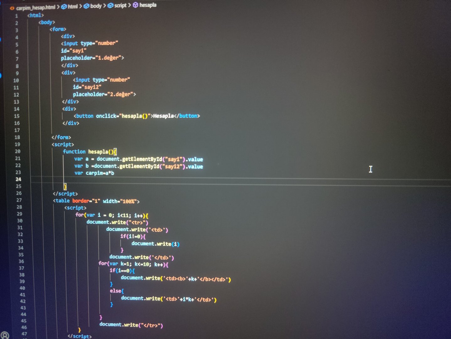 HTML JavaScript konusunda yardıma ihtiyacım var. Yazdığım bir kod var çarpım tablosu ve çarpma işlemi hesaplayan bir kod amacım seçtiğim iki sayının çarpımı tabloda kırmızı renkle belirtilmesi.