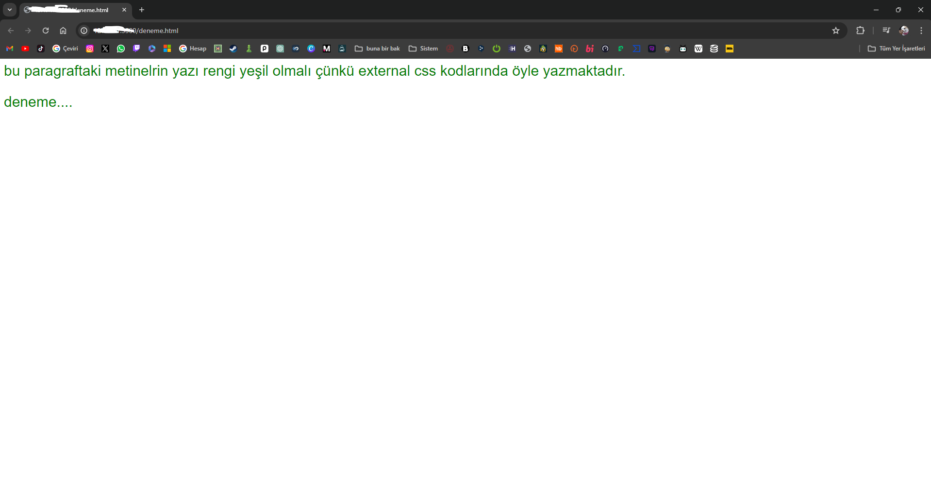 <body><p>bu paragraftaki metinelrin yazı rengi yeşil olmalı çünkü external css kodlarında öyle yazmaktadır.</p>