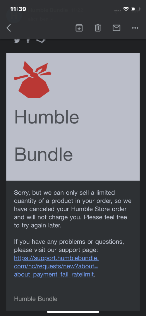 sorry, but we can only sell a limited quantity of a product in your order, so we have canceled your humble Store order and will not charge you. Please feel Free to try again later.