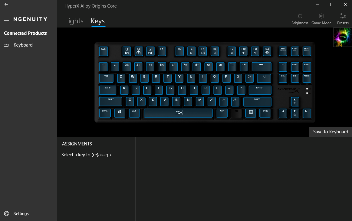 Alloy Origins Core'un kasasında havacılık sınıfı alüminyum gövde kullanılmış ve kasasının fazlasıyla sağlam olduğunu söyleyebilirim. Klavye tam RGB ve HyperX NGenuity yazılımından ışıkların kontrolü sağlanıyor.