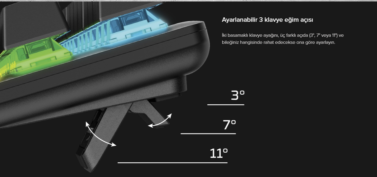 Klavyenin bir diğer sevdiğim yanı klavyenin 3 adet yükseklik ayarı bulunması. Klavyenin altındaki 2 katlanabilir ayak sayesinde ister ayakları kapatıp klavyeyi tamamen düz kullanabilir, ister ayakları alçak ayarda açıp hem çok yüksek olmamasını hem de çok alçak olmamasını sağlayabiliyorsunuz. Veya ayakları tamamen açıp klavyeyi en yüksek ayarda kullanabiliyorsunuz.