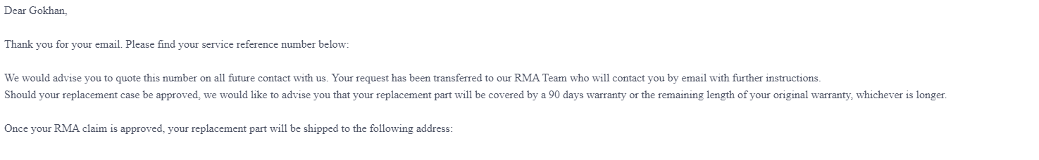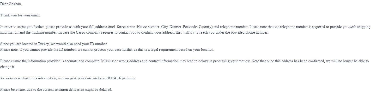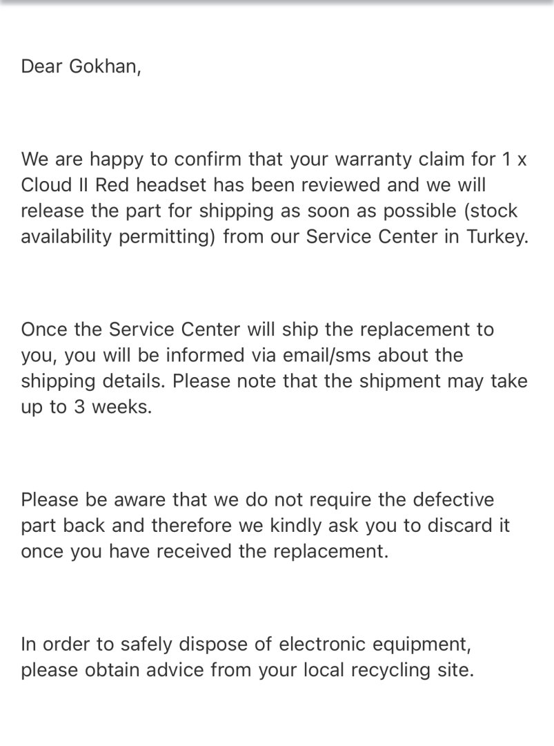 İletişim bilgilerinizi, ev adresinizi ve kimlik numaranızı istiyorlar. Daha sonrasında bu bilgilerle RMA talebi açılacak. Duruma göre onaylanırsa talebiniz vermiş olduğunuz adrese ürünün aynısından gönderecekler. HyperX desteğe sordum ve biz parça göndermiyoruz ürünü gönderiyoruz dediler. Eski üründe bizde kalıyor. Benim yeni kulaklığım geldin mesela. Ama bendeki versiyon Kingston iken gelen kulaklıkta menteşe kısmında HP üretim olduğu yazıyordu.