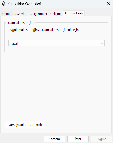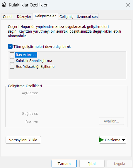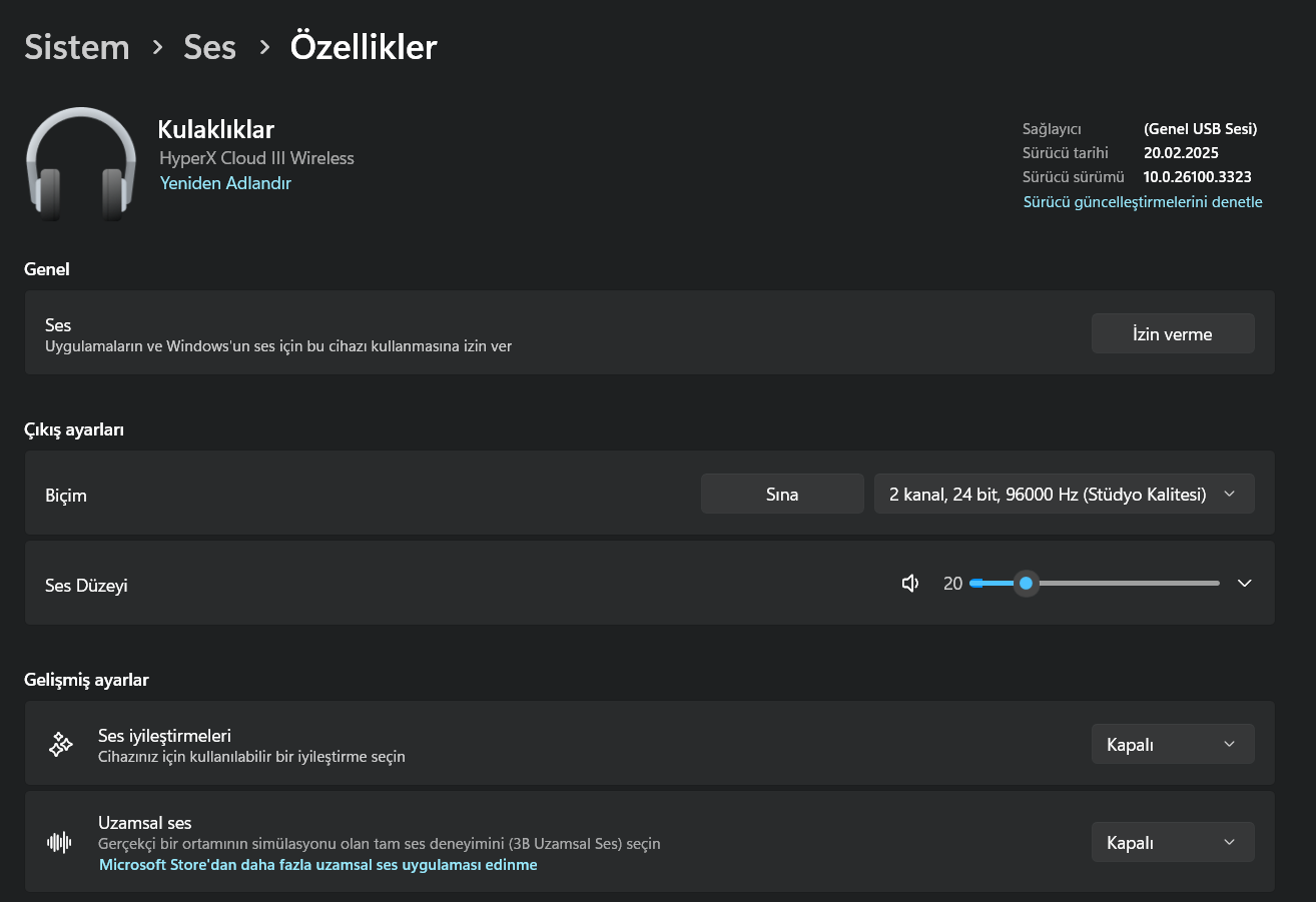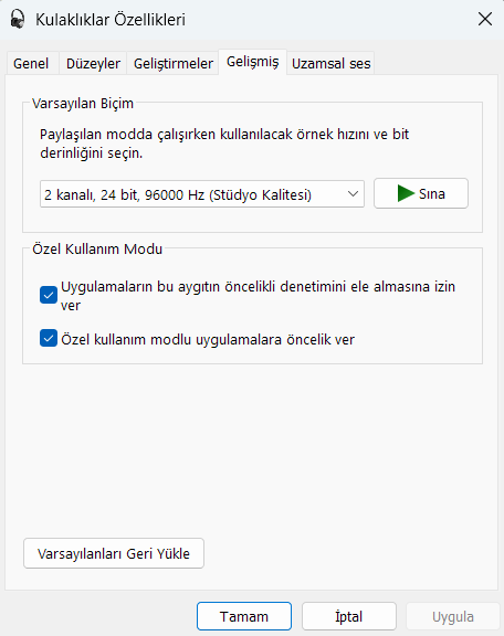 Windows 11 ses ayarları bu şekilde olmalı. Bu şekilde hem stereo kullanırsın hem de cızırtı minimum olması lazım.