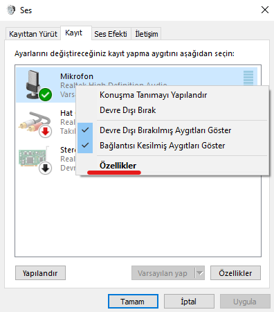 Kulaklığın mikrofonuna sağ tıklayın ve Özellikler'e basın,