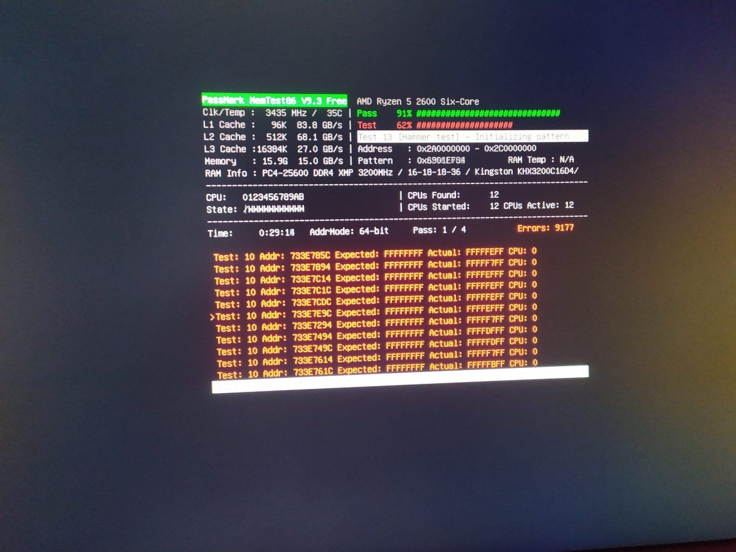 Merhaba, HyperX Fury 3200MHz CL16 RAM kullanıyorum. Oyunlarda durduk yere masaüstüne atıyordu bundan dolayı testler yapmaya başladım. Fakat sorunun yazılımsal olduğunu düşünüyorum. Memtest log dosyalarını kayıtlarını bulamadım ama kamera ile çektiğim sorunlar var. Ayrıyeten Windows bellek tanımlama testinde de donanımsal sorunlar algılandı hatası veriyor. Bilgisayar bileşenlerim tam olarak da şöyle R5 2600, RTX 2060, MSI B450M Gaming Plus. BIOS son sürümü ile bir önceki sürümü ile de test ettim sonuçlar değişmedi.