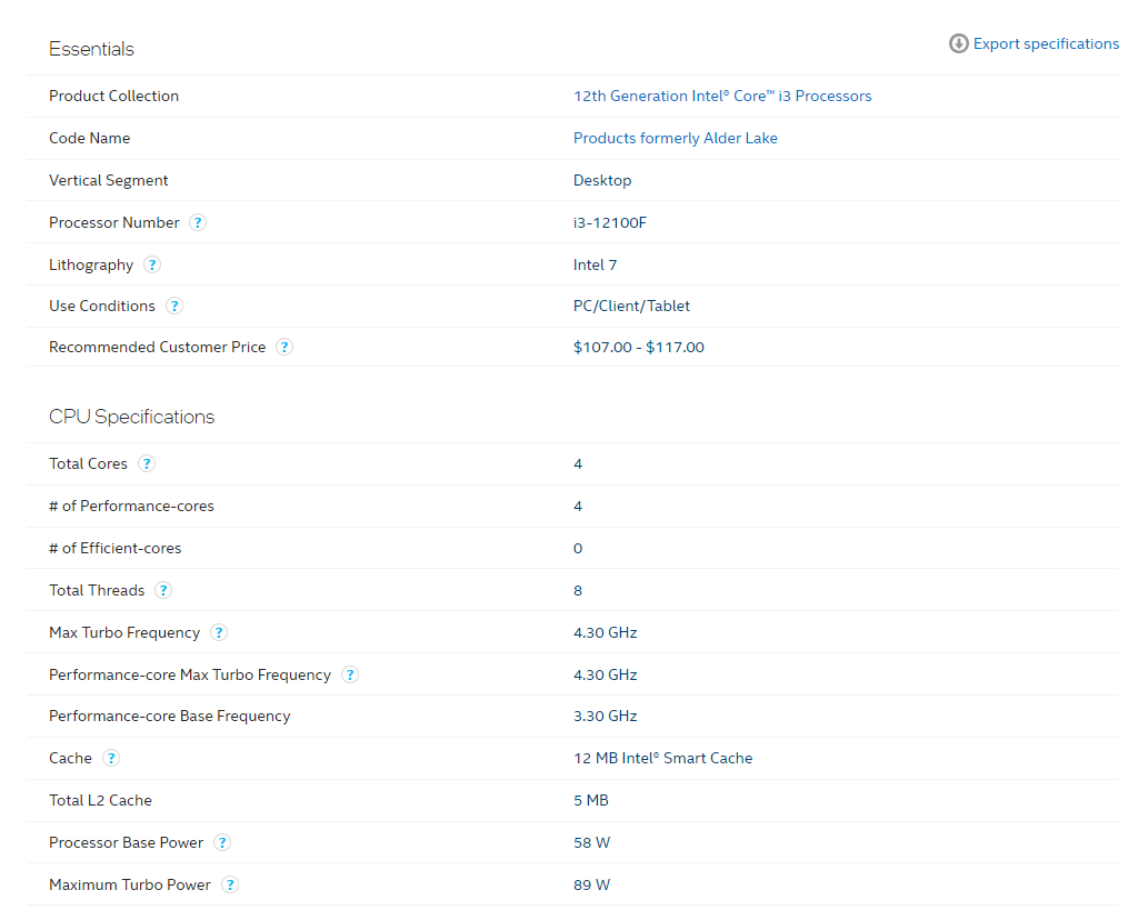 Intel® Core™ i3-12100F Processor (12M Cache, up to 4.30 GHz) quick reference with specifications, features, and technologies.