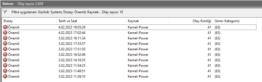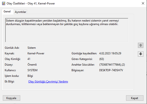 Merhaba. Bilgisayarım bazen oyun oynarken bazen de günlük işleri yaparken aniden donup yeniden başlıyor. Şu sıralar mavi ekran hatası almıyorum ama bir anda donuyor ve yeniden başlıyor. Olay görüntüleyicisine baktığımda ise her yeniden başlamanın sonrasında gördüğüm hata "Kernel Power" kaynaklı bir hata. Açıklamasında ise "sistem düzgün kapatılmadan yeniden başlatılmış. Bu hatanın nedeni sistemin yanıt vermeyi durdurması, kilitlenmesi veya beklenmeyen bir şekilde güç kaybına uğramış olması olabilir." yazıyor. 1 hafta öncesinde "VIDEO_TDR_FAILURE" mavi ekran hatası alıyordum. Bu hatayı ekran kartı yazılımını güncelleyerek çözmüştüm. Fakat daha sonrasında ise aniden yeniden başlamalar ve "Kernel Power" kaynaklı hata ile karşılaşmaya başladım.