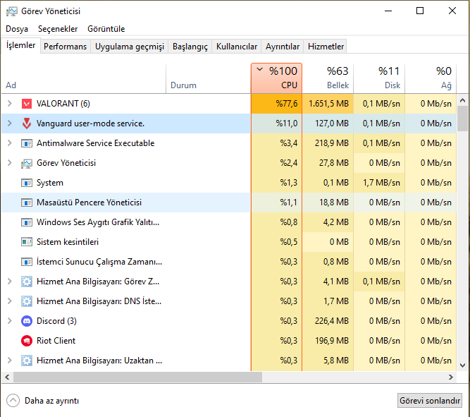 Bilgisayarım eskiden gayet güzel Valorant oynatıyordu. 200 FPS falan alıyordum. Fakat son 1 aydır uğraştığım ve sorunu hala çözemediğim bir problemim var. Valorant'ı açtığımda menüde bile gereksiz fazla bir CPU kullanımı oluyor. Poligona giriyorum 150 FPS civarı alıyorum fakat fazla CPU kullandığından dolayı çok fazla drop yiyorum. (Poligon'da %80-%90 oluyor ) grafikleri yükselt diyenler oldu onu da denedim işe yaramadı Görev Yöneticisi'nden vgc yi düşük ayarla falan dediler onu da yaptım fakat değişen bir şey yok. Aşağıdaki fotoğraf menüde kullanılan CPU yüzdesi. Valorant'ı çok oynamak istiyorum fakat bir türlü çözemedim bu sorunu. Birisi yardım edebilirse gerçekten çok sevinirim...