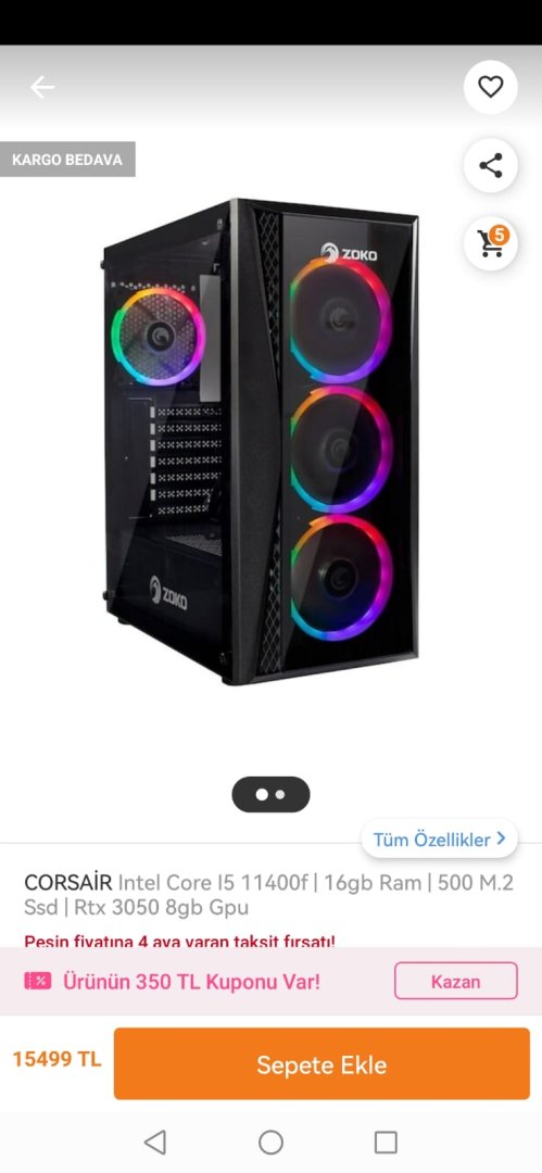 Özellikleri: Intel Core i5 11400F, 16 GB RAM, 500 M.2 SSD, RTX 3050 8 GB.
