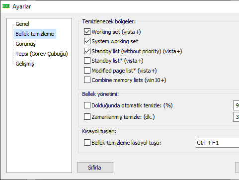 Onlar aynen kalsın orayı elleme. Bende Windows açıldığında başlat açık. Bellek temizleme sonuçlarını göster kapalı. Sizde kapatın çok kullanıyorsanız.
