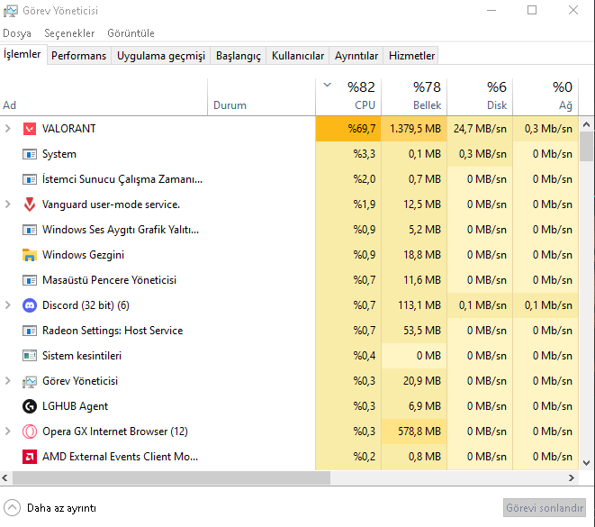 Hocam arkada bir sürü şey açık. Valorant'ı Opera'yı Discord'u kapatın. Kullanmadığınız gereksiz programları kapatın öyle sonuçları atın. Valorant açıkken bu değerleri atmak anlamsız çünkü sistem yük altında.