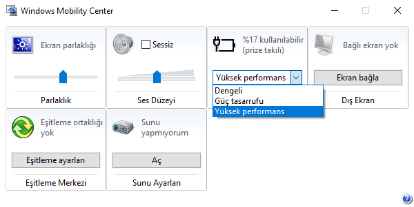 Eğer Denetim Masası'nda yüksek performans modunu görmüyorsanız, Mobility Center üzerinden alın.
