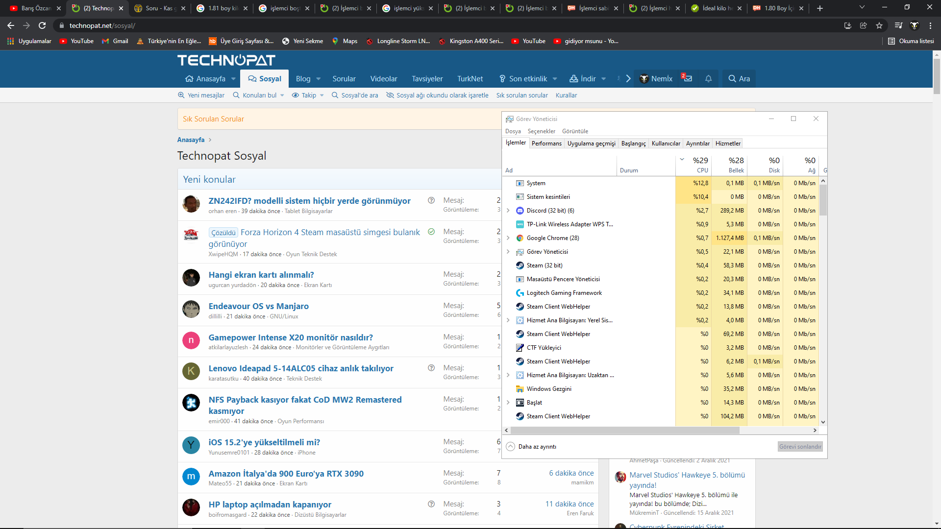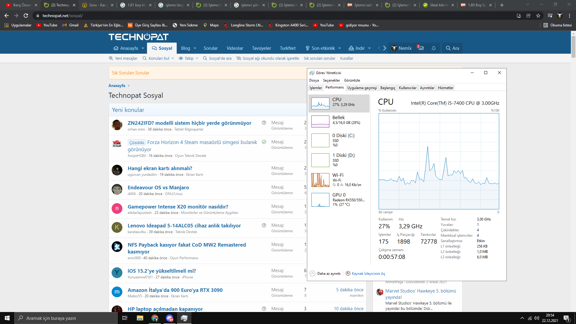 Sistem "i5 7400, RX 550, 16 GB DDR4 2133 MHz RAM, 2X SSD 240 GB + 120GB" sistem bu şekilde. Arkada TP-Link alıcının programı, AMD software, Logitech Gaming Software, Steam ve Google açık onlarda fotoğrafta görüldüğü üzere az kullanıyor. Sıcaklıklar ise: İşlemci boşta 47-49 arası, ekran kartı boşta 27-32 arası anakart boşta 36-40 arası değişiyor. İşlemcinin neden bu kadar GHz'i yüksek ve neden bu kadar çok yiyor?