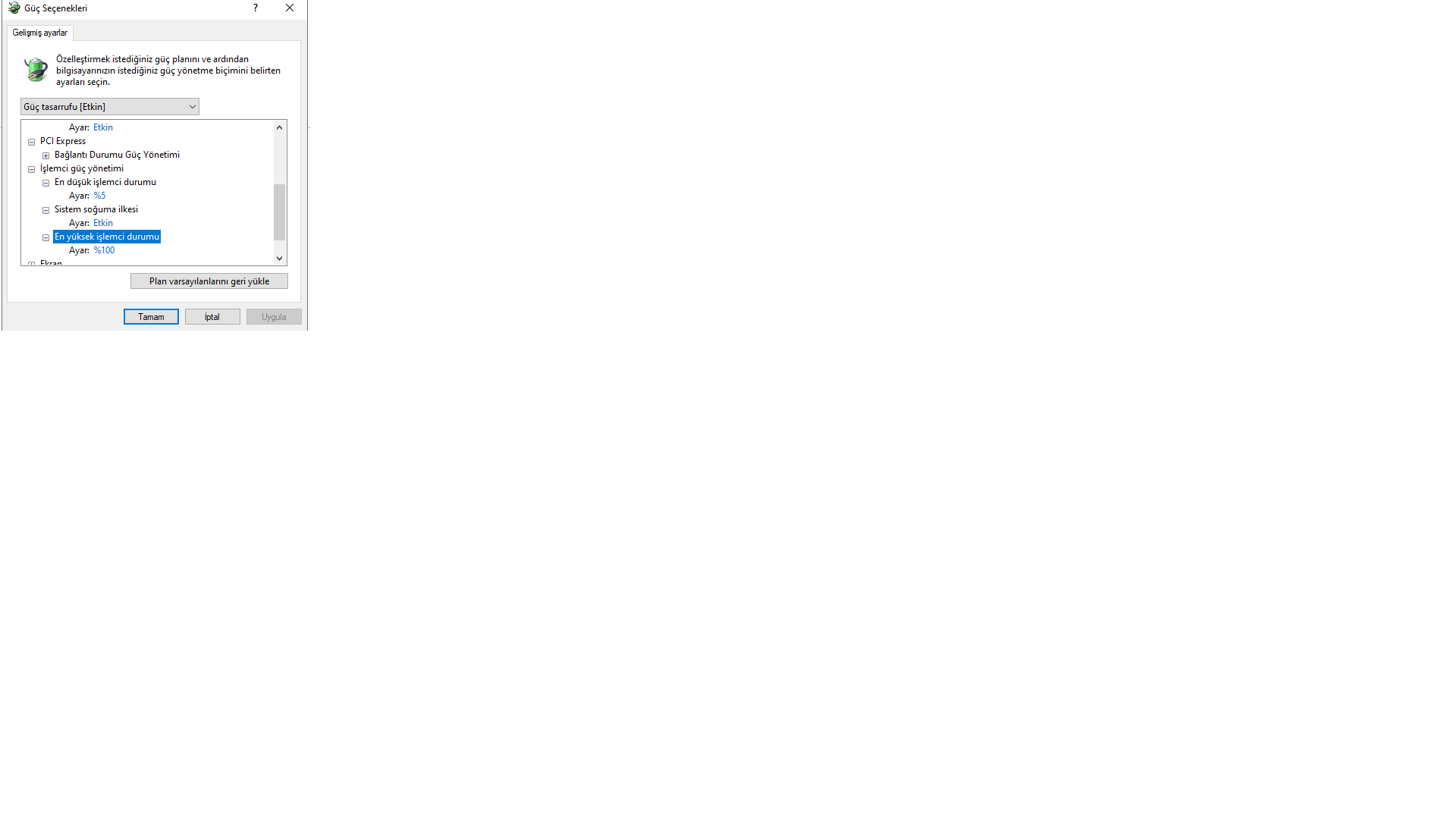 Çok sıcak çalışmıyorsa sorun yok hocam rahatınıza bakın. En yüksek işlemci durumunu %90 yapabilirsiniz illa düşürmek istiyorsanız ama oyunlarda da performans düşüşü görebilirsiniz.